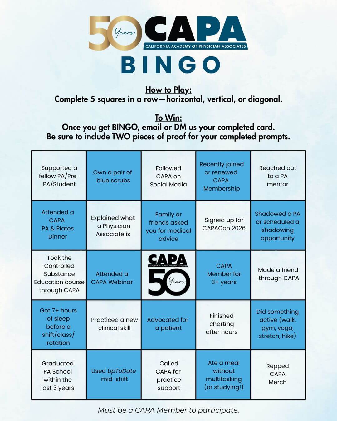 The first 50 members to complete BINGO will be entered into a raffle for a CAPA Merch Bundle: 50th Anniversary Tote, CAPA Polo, Koozie, 50th Anniversary T-Shirt, and stickers.